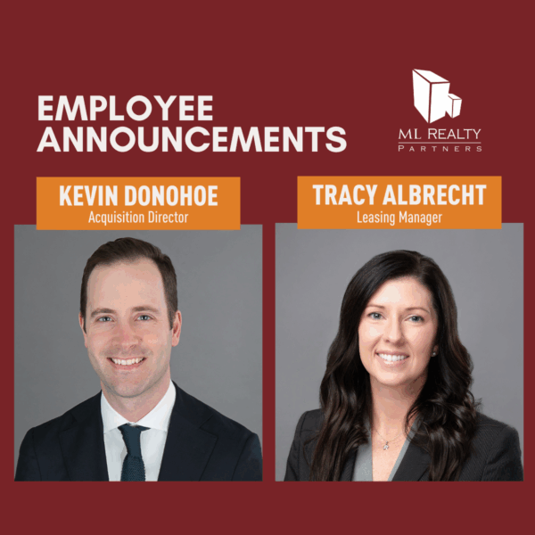 ML Realty Partners is pleased to announce two strategic internal moves that will further drive the firm’s growth in acquisitions and leasing. Kevin Donohoe has been promoted to Acquisition Director and Tracy Albrecht will take on an expanded role in leasing as Leasing Manager.